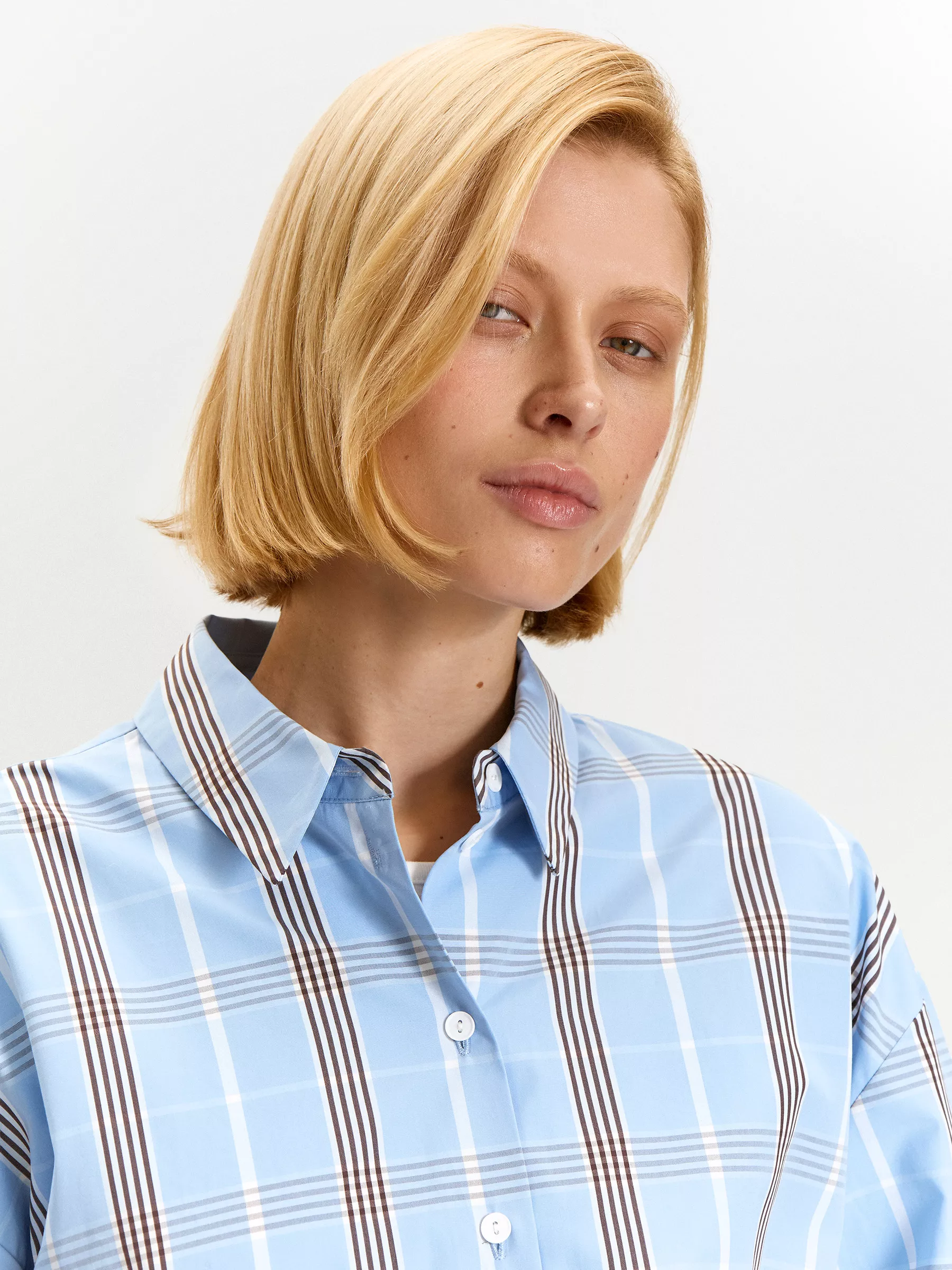 Голубая рубашка в клетку с актуальным кроем освежит повседневный гардероб.