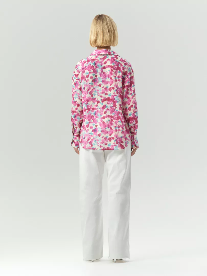 Рубашка из тенсела для ярких и комфортных образов. Красочный акварельный принт напоминает россыпь лепестков. Спущенная линия плеча делает стиль образов более непринуждённым, а высокие манжеты на пуговицах подчёркивают элегантность. Блуза подойдёт как для праздничных, так и для повседневных образов. Сочетается с любым базовым низом.