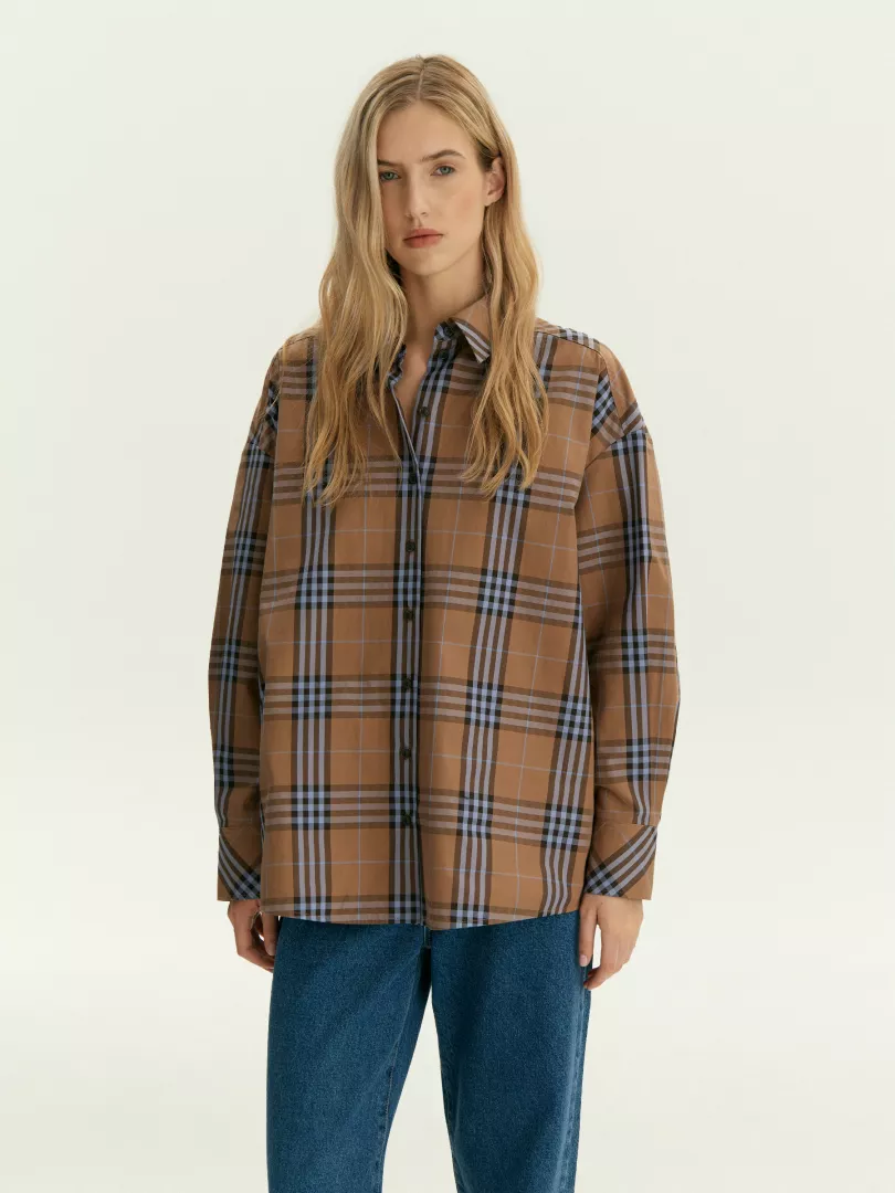 Коричневая рубашка в голубую клетку для повседневных образов. Сделана из хлопка. Модель выполнена с кокеткой на спинке и патами на рукавах сзади. Сочетается с любым базовым денимом и другими вариантами низа.