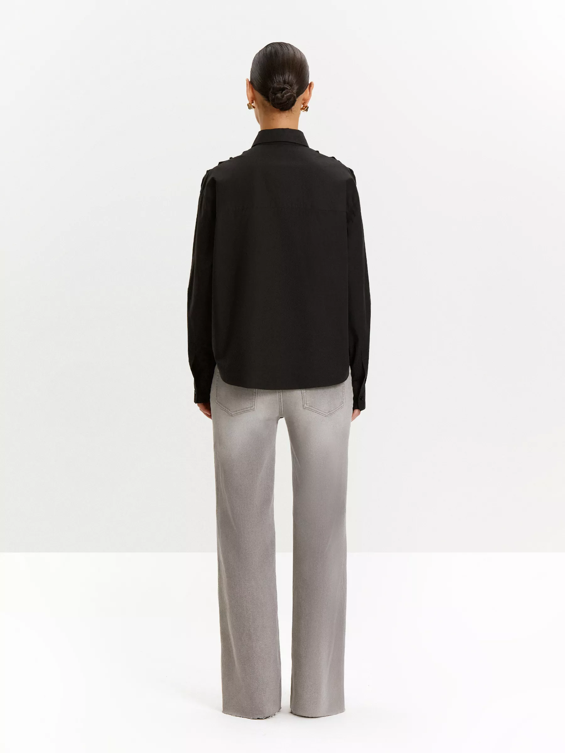 Трендовая чёрная рубашка вдохновлена техникой папье-маше и модой на восточные мотивы. Изысканные объемные аппликации представляют собой стилизованные цветы лотоса.