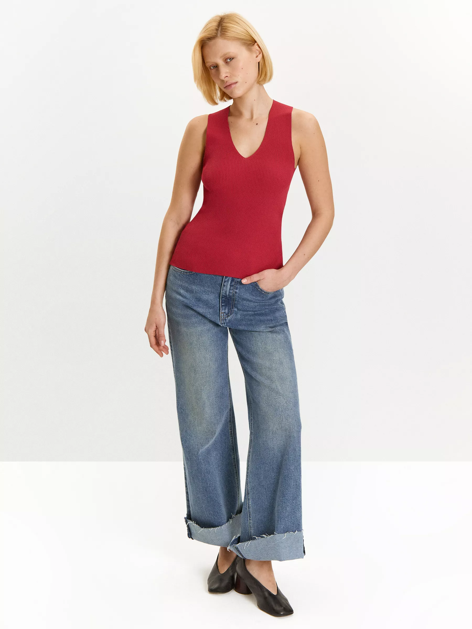 Трикотажный топ красного цвета. Выполнен из материала в рубчик с высоким содержанием вискозы в составе. Глубокий V-образный вырез открывает ключицы и шею. Модель приталенного силуэта мягко прилегает к телу. Топ дополнит образ с любым базовым низом.