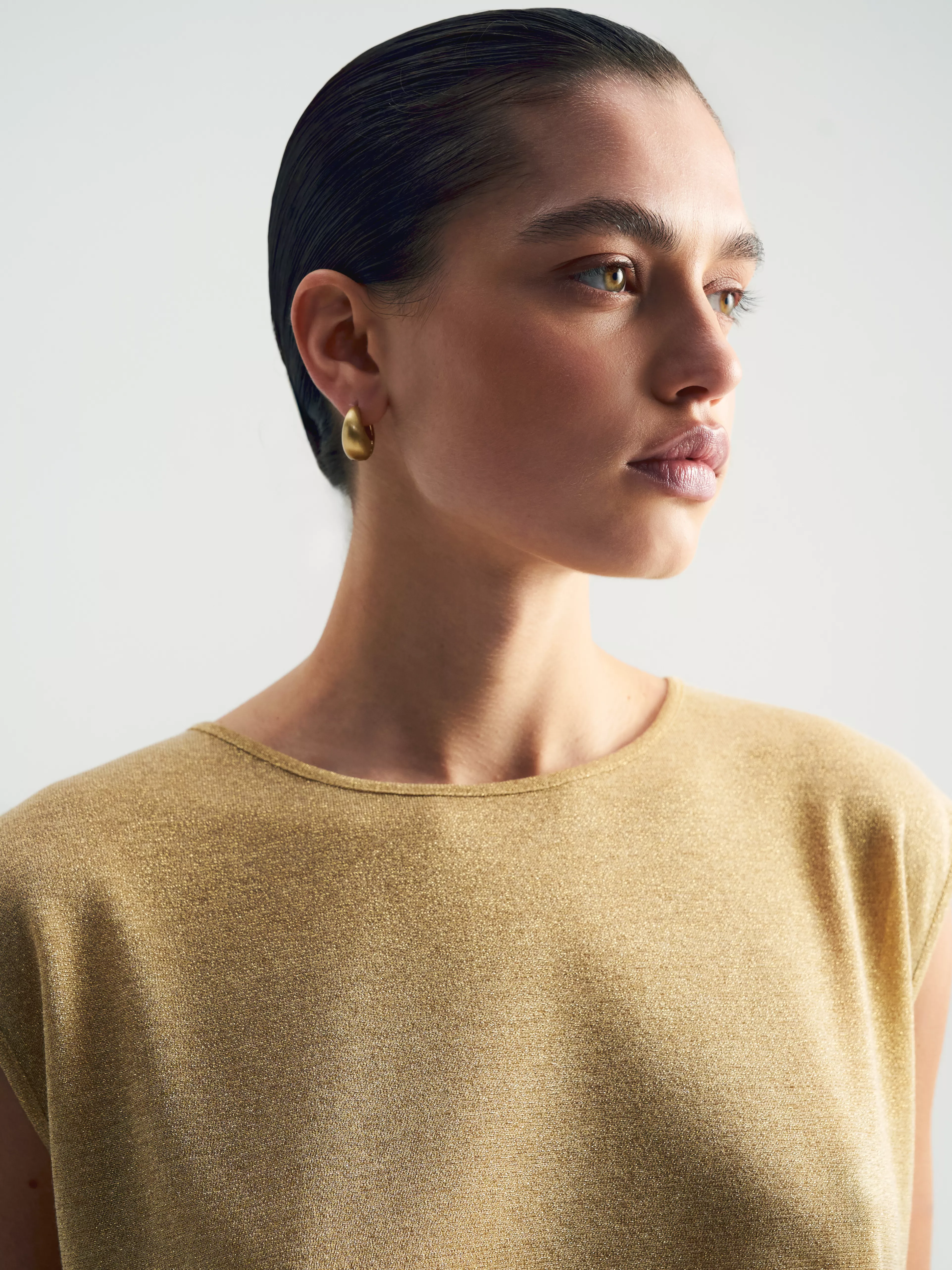 Бежевый топ с золотистым люрексом станет любимой вещью в гардеробе. Подходит не только на особый случай, но и чтобы поднять настроение в будни.
