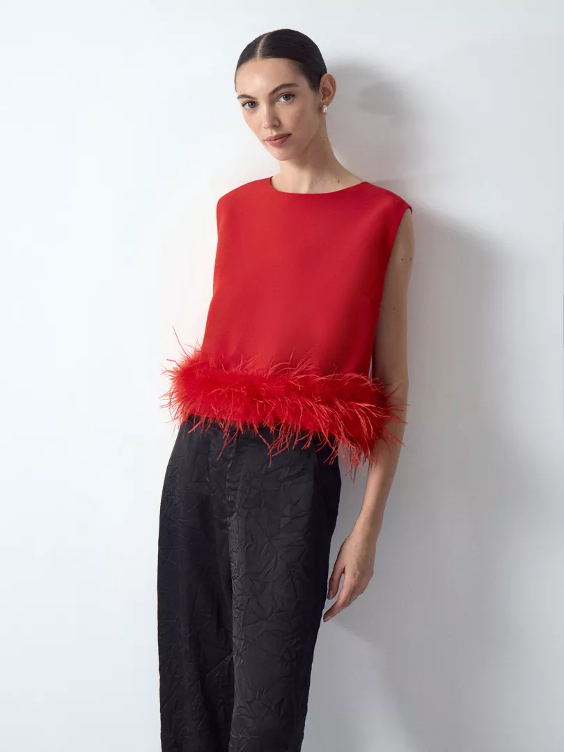 Коктейльный топ в красном цвете с двойным рядом перьев по низу. Укороченная прямая модель с круглым вырезом отлично подойдёт к брюкам или юбкам с завышенной посадкой. С топом можно собирать запоминающиеся монохромные образы или сделать его единственным акцентом образа. Изделие выполнено на подкладке. Перьевой декор не отстёгивается.