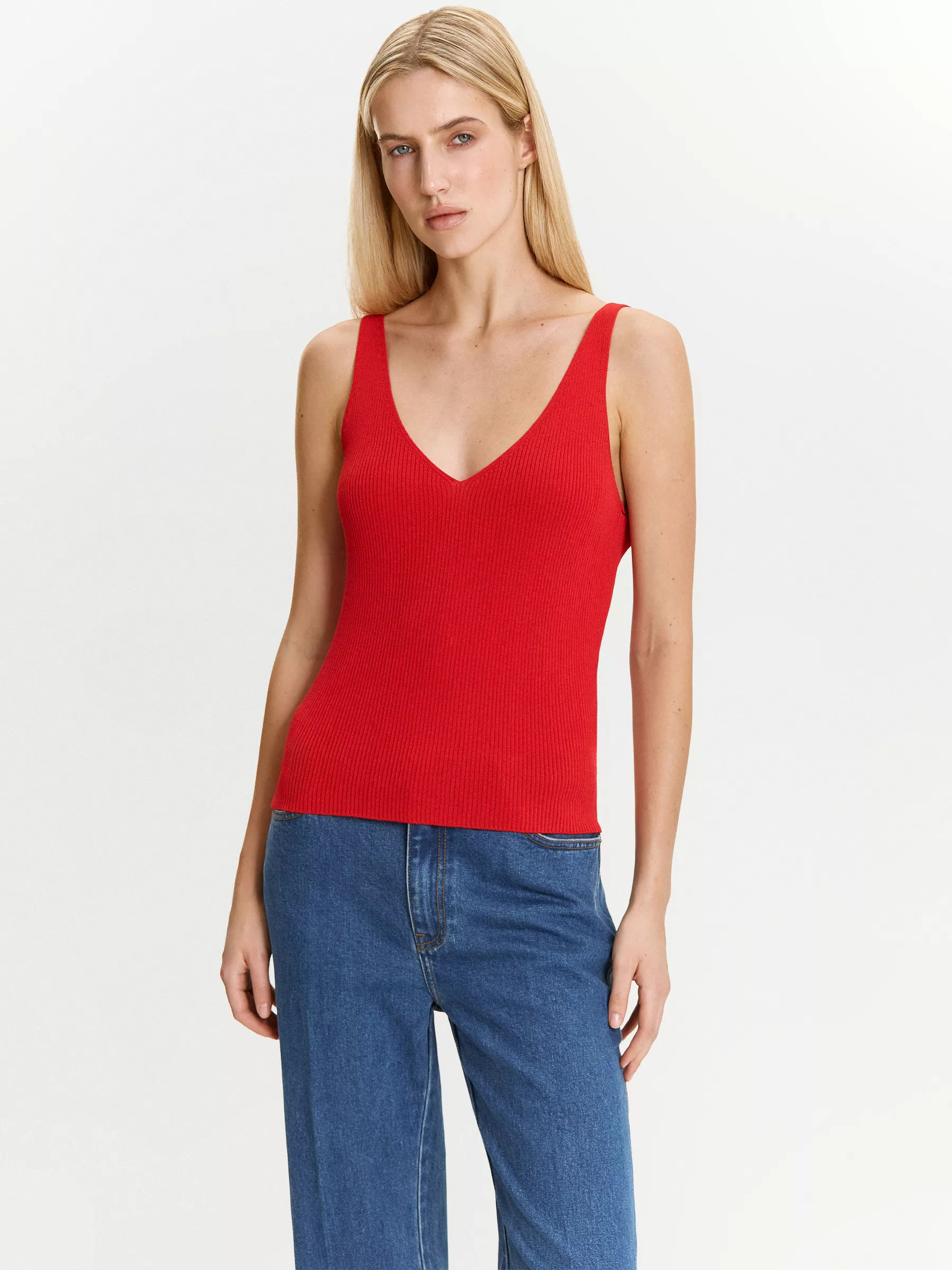 Трикотажный топ в красном цвете станет основой множества образов для повседневных выходов и не только.