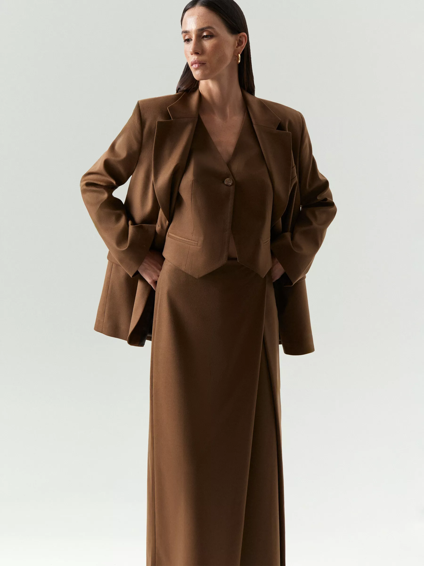 Юбка в трендах года и в одном из модных цветов — мокко. Сделана из комфортного, мягкого материала, по ощущениям немного напоминающего байку. В составе — почти четверть шерсти и ещё четверть вискозы. Модель без пояса выполнена с нахлёстом-имитацией запаха, сзади имеется шлица. А-силуэт, высокая посадка и длина мидакси делают юбку универсальной. Образ можно дополнить жакетом или жилетом из комплекта stingray.