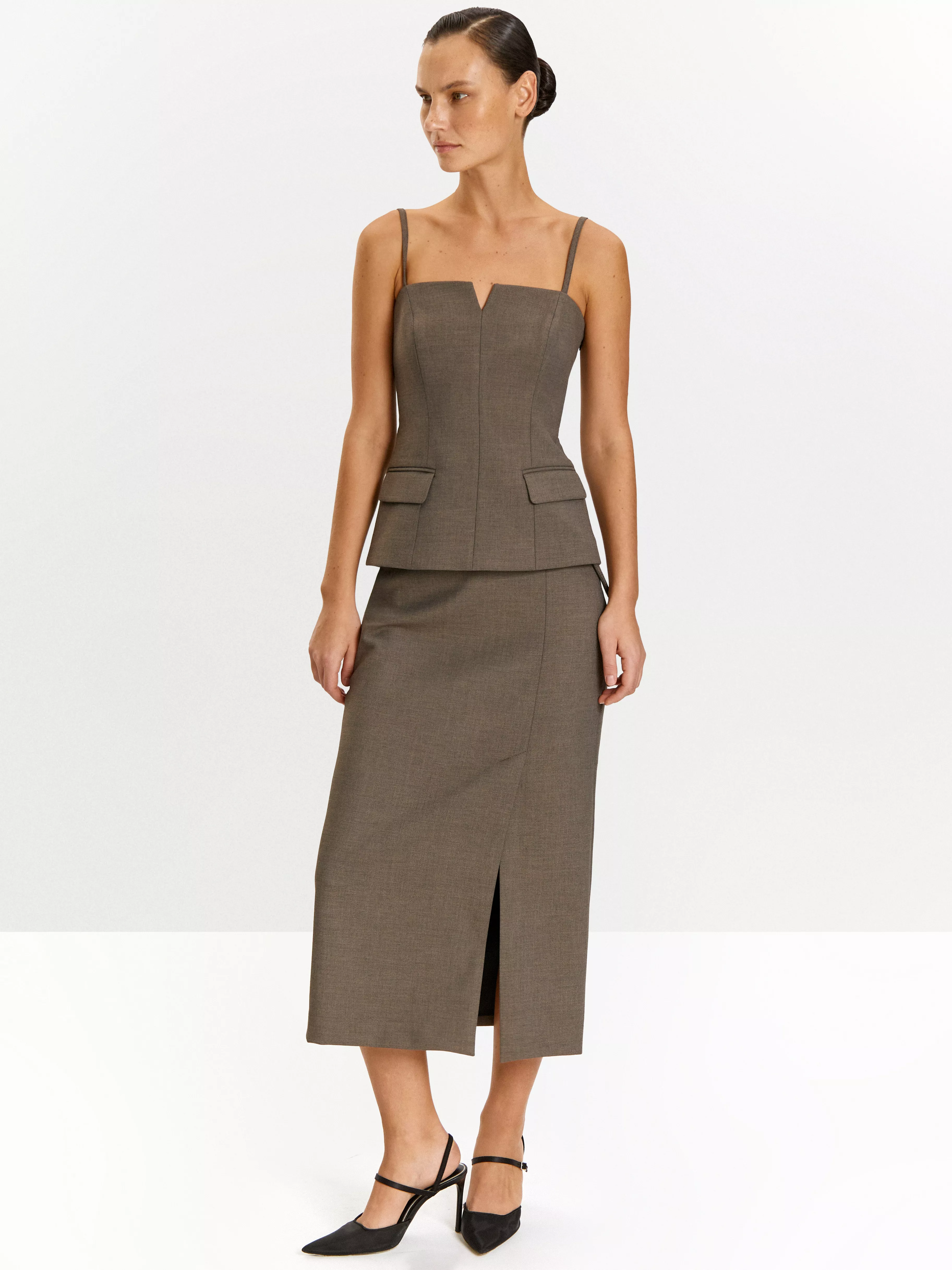 Юбка может стать частью универсальной капсулы с топом, жакетом и брюками choco.