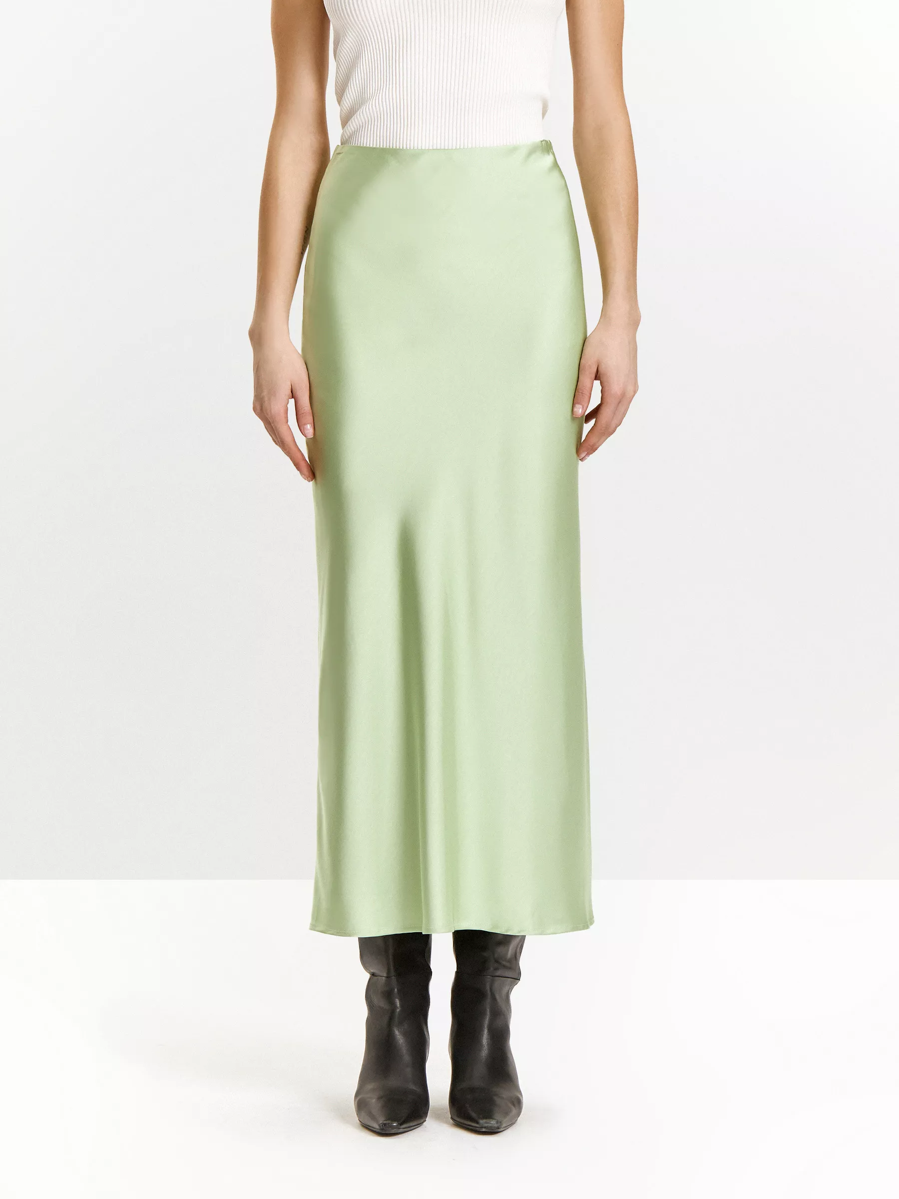 Пастель в прочтении нового сезона — этот актуальный оттенок легко впишется в любой гардероб. Сатиновая юбка нежно-салатового цвета может стать идеальным выбором для выходного дня, офисных мероприятий, лекций и театра, бранчей и SPA, прогулок и встреч с подругами. Гладкая и приятная на ощупь, на комфортной вискозной подкладке, она дарит удовольствие от каждого шага. Модель А-силуэта имеет длину миди и высокую посадку, красиво подчеркнёт фигуру. Дополнить образ можно атласной блузкой или шёлковым топом с кружевной вставкой. Юбка будет кстати каждый раз, когда нужен нарядный образ без лишних деталей. Сочетать этот цвет можно с оттенками молочного, бежевого, персикового и светло-розового, пастельными оттенками жёлтого.