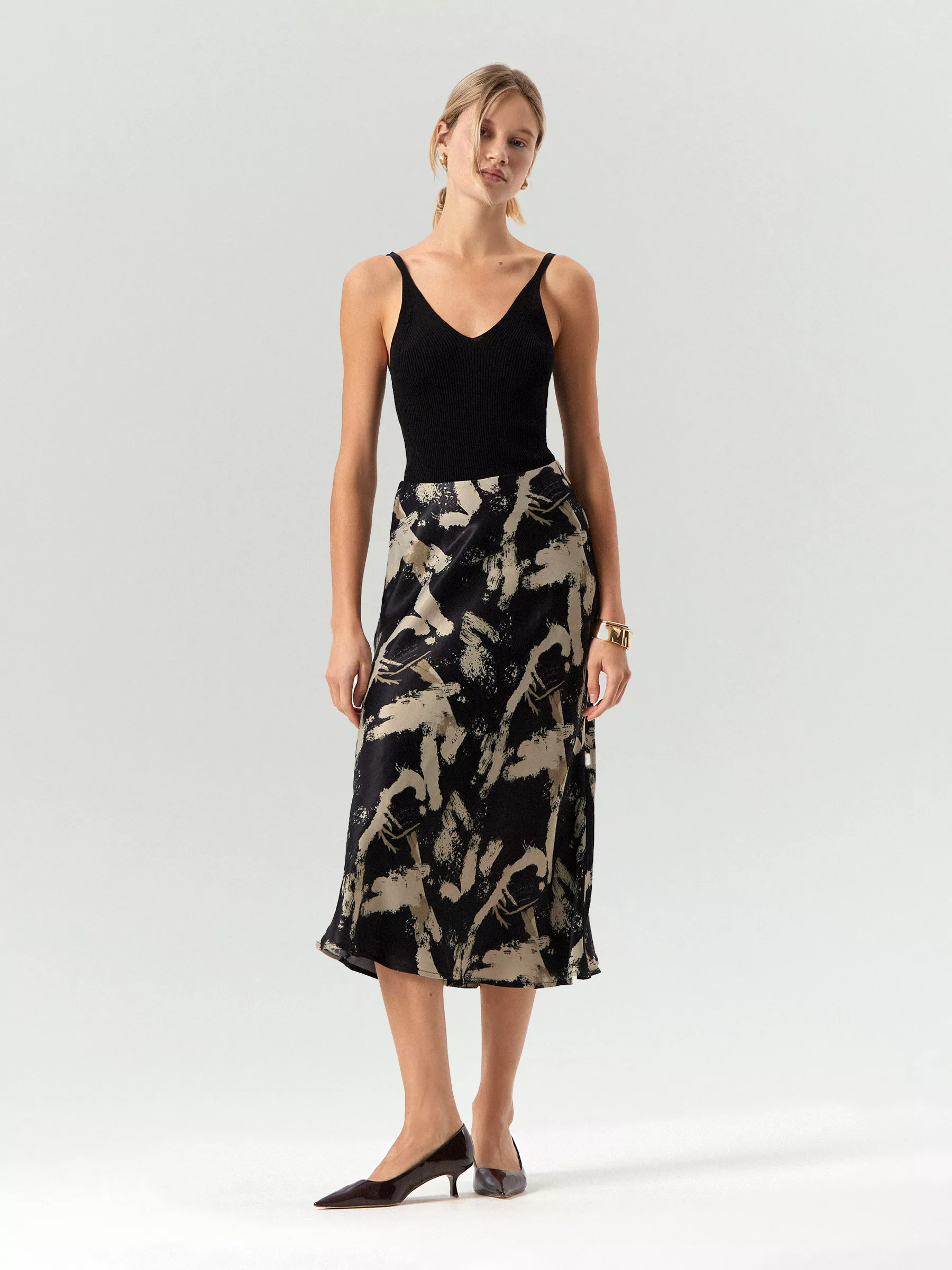 Юбка из приятной к телу вискозы с абстрактным принтом. Крупные мазки в цвете полыни на чёрном фоне освежат образ. Модель А-силуэта в длине миди имеет высокую посадку. Юбка отлично сочетается с нежными бельевыми топами и блузами в оттенках зеленого, подойдёт для создания повседневных образов, сочетается с футболками, трикотажем, жакетами и другими элементами базового гардероба.