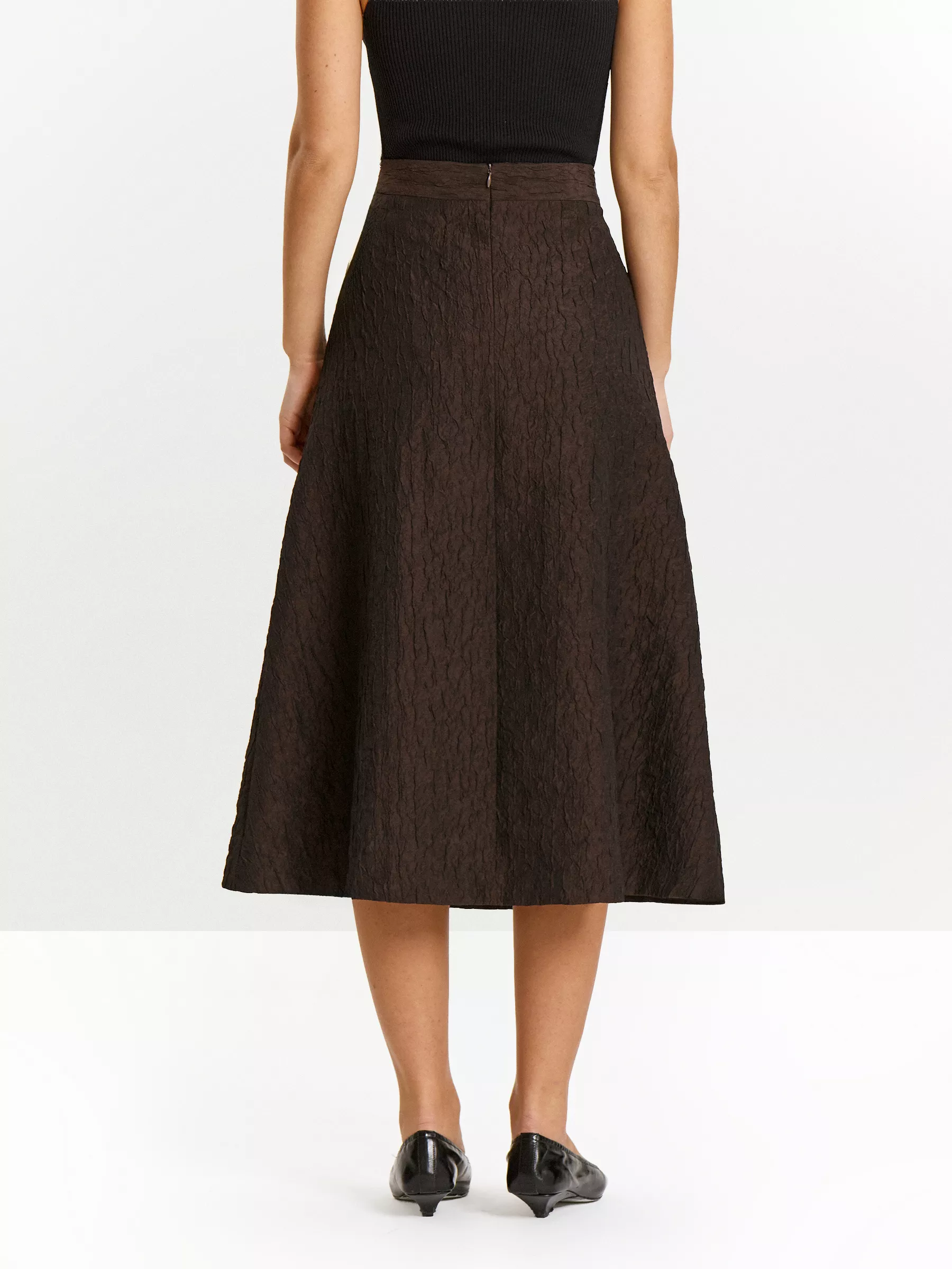 Модель имеет универсальную длину миди и актуальную завышенную посадку, которая красиво подчёркивает талию.